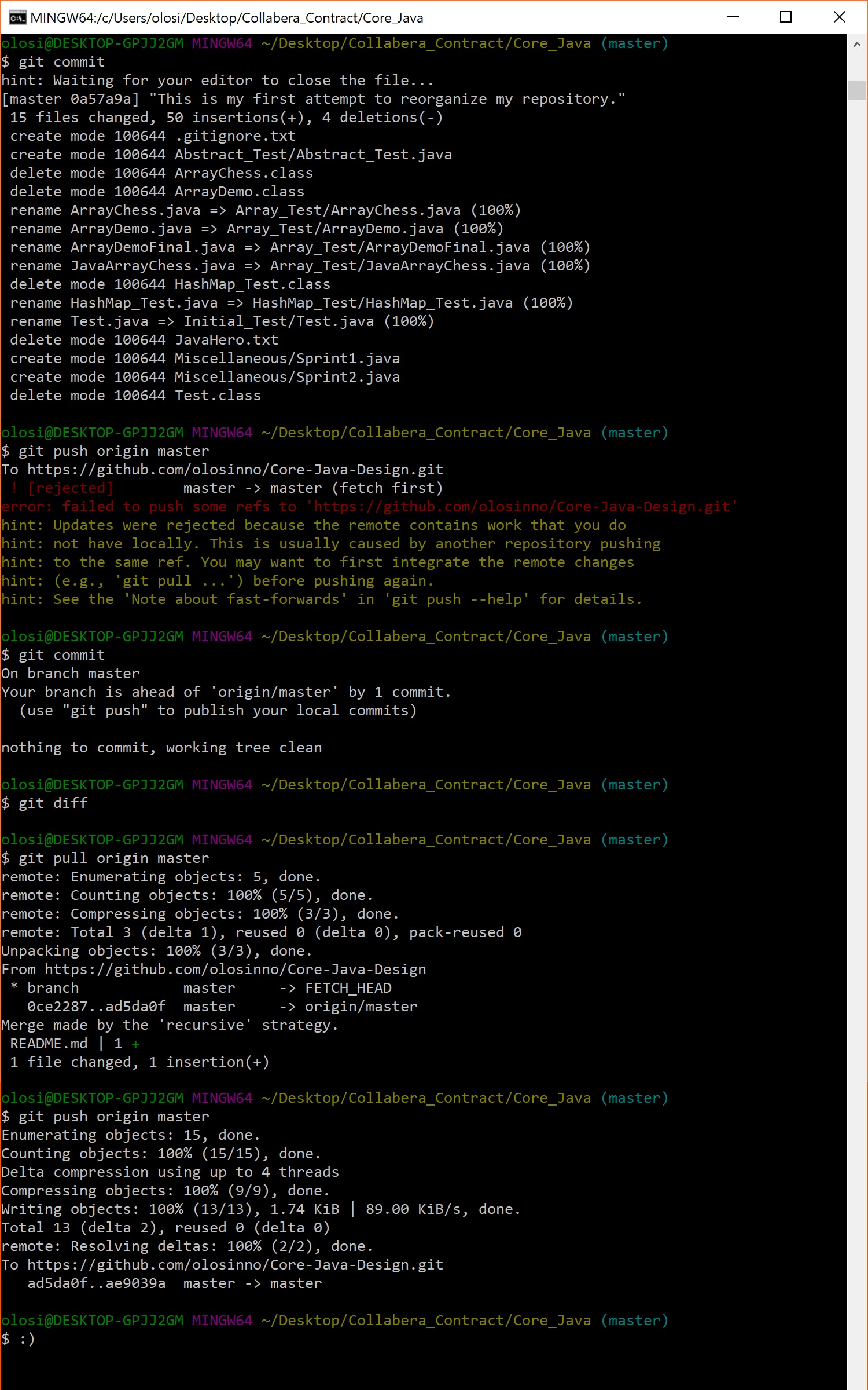 Following the hints on command line during my failed push turned out to be very helpful! I pulled, then pushed – like opening a stubborn door! At last I had achieved a clean repository!
